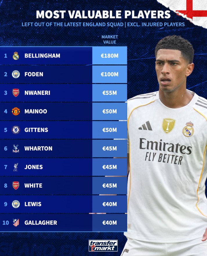 英格兰队公布了最新一期球队大名单,与此同时德转也统计了本次未能入选的球员身价榜单(受伤球员不在统计范围内)。